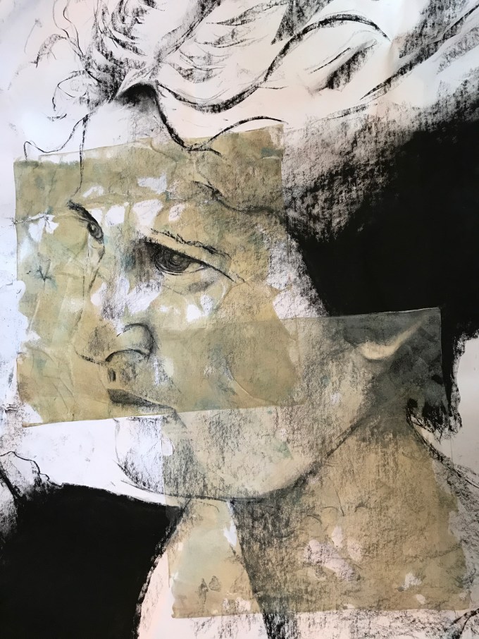 This piece was drawn in charcoal on board, covered with several layers of acrylic satin medium mixed with white acrylic and “aged” with tea. It measures 24″ x 40″. This piece was sold at the Mystic Art Museum in May.