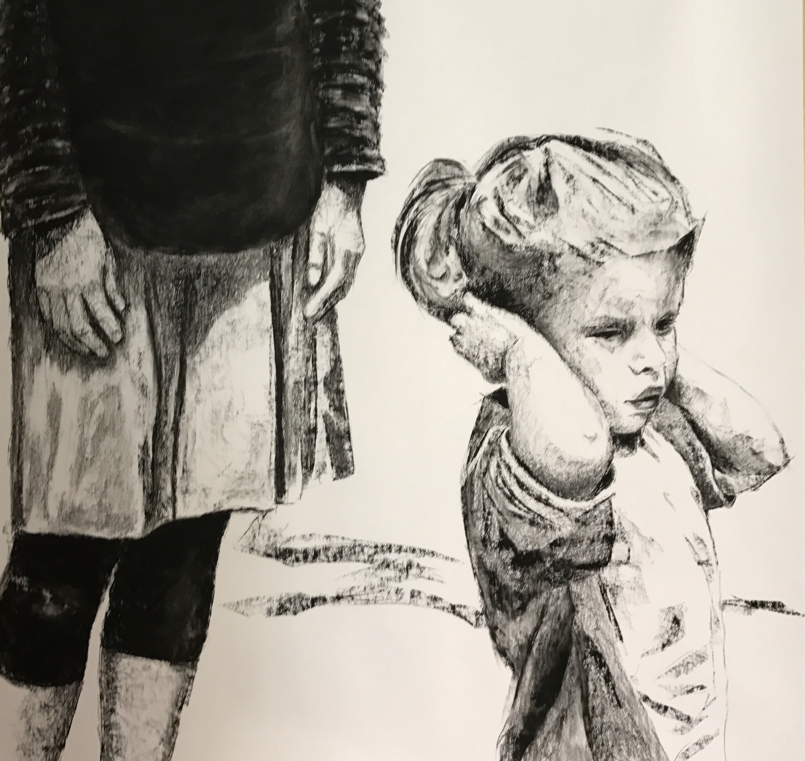This is charcoal drawing with layers of clear acrylic as a sealer on board. I have been enjoying making images in this way in my recent work. This image was inspired by a photo from the 1940’s, taken from an album of my mother’s childhood. My Mom was taken away from her parents and lived most of her life as a foster child. She often had to stand up and help her siblings through this often difficult life experience. I was a teacher for many years myself and I had many students who traveled the often challenging life of foster homes. We all need a strong friend sometimes.