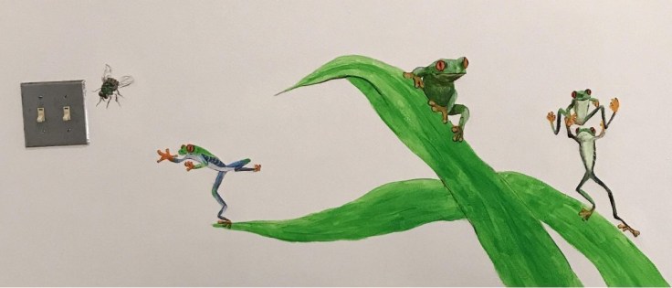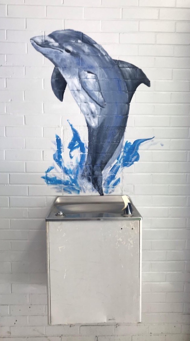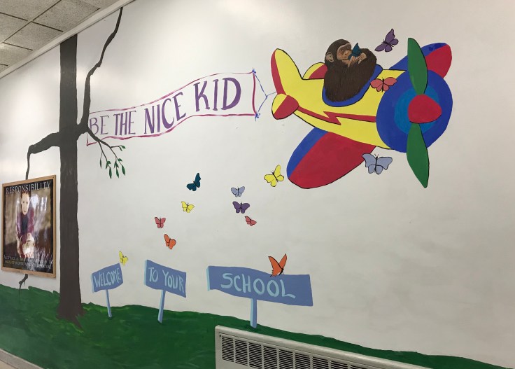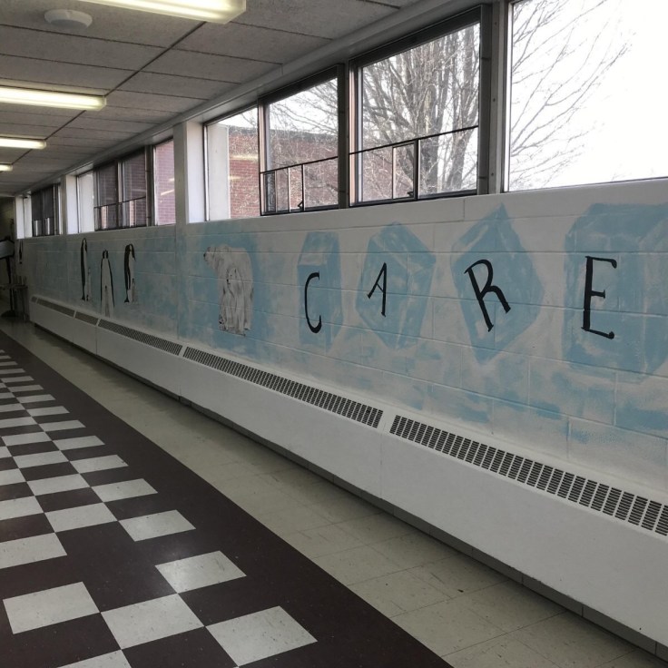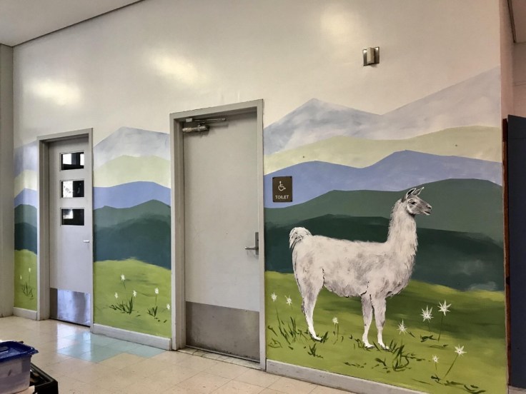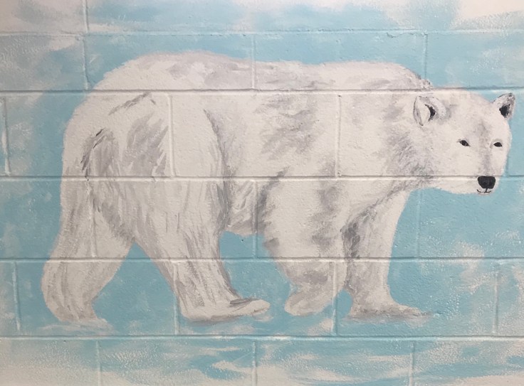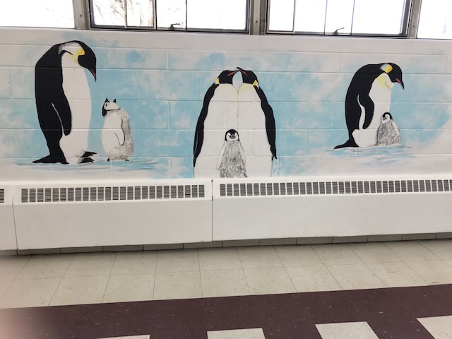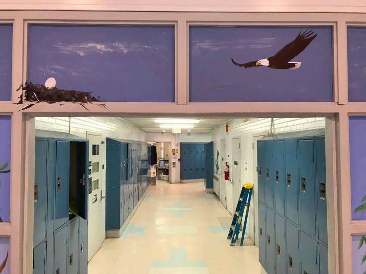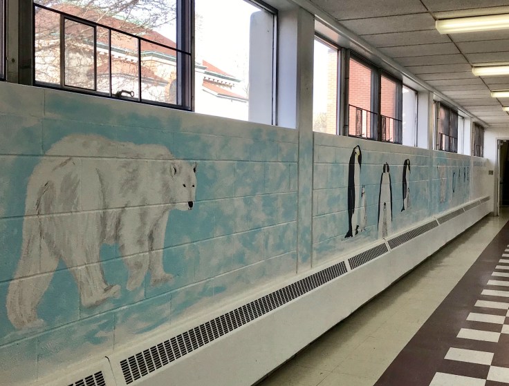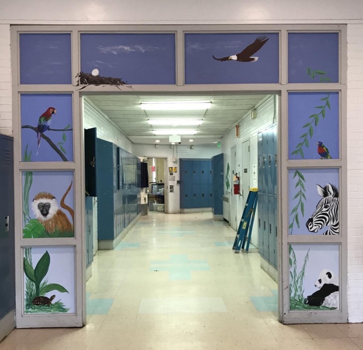 I just completed a five week mural painting project. This school high school building will be the temporary home of the elementary school in our town for the next year. The school walls were blank and white and I had full rein as to what I wanted to paint and where, I volunteered to do this as a gift to help this transition period be more pleasant for the students and staff. The time frame available was just five weeks. I covered the two main areas of the hallways, putting in over 120 hours of painting time. Great energizing work! The high school students were very encouraging as I was painting while School was in session as well as after school. My goal was to make it a welcoming place for the little ones. The regular elementary school is being refurbished and the kids will return there in the fall of 2020. The building where I have painted the murals will then be torn down. I have heard people say that I did a lot of work and it’s a shame it will all be demolished, but a year is a long time in the life of a child, so for me it was totally worth it. I think they will enjoy this year.